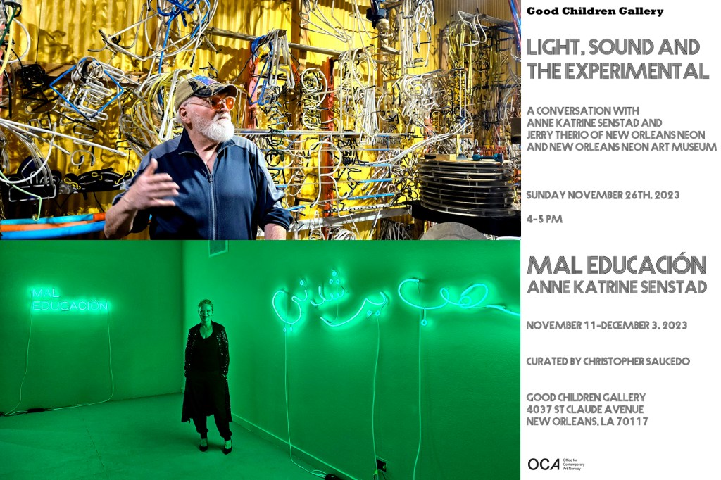 A conversation on Light, Sound, and the Experimental, with artist Anne Katrine Senstad and Jerry Therio of New Orleans Neon and the New Orleans Neon Art Museum, on the occasion of Senstad’s solo exhibition Mal Educación.