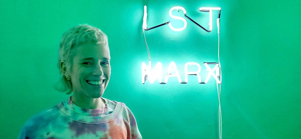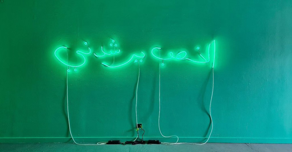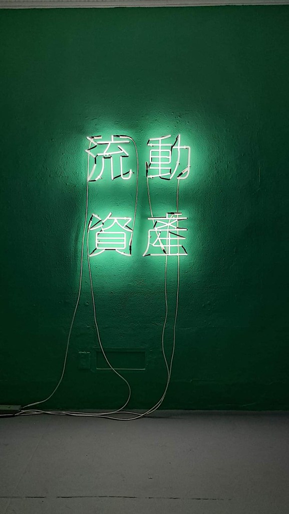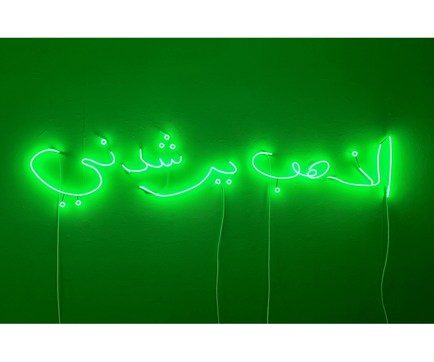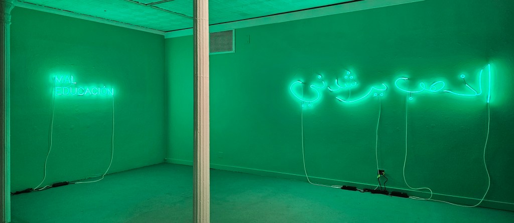 For the center-piece of the exhibition, Senstad returns to a poetic evocation of ethics that her work has explored in the past, Gold Guides Me — a neon text work in Arabic calligraphy transliterated in the artist’s handwriting. Those familiar with Senstad’s oeuvre will identify the reference to her monumental work commissioned by the Bruges Art and Architecture Triennale in Belgium in 2015 where said phrase was presented in latin alphabet letters scaled after the Hollywood sign. Gold Guides Me capitalizes on the phrase, Hope Guides Me from the 6th century poet and statesman Boethius’s The Consolation of Philosophy — a valediction for Lady Philosophy of life’s vagaries and vicissitudes as conjured by the author while imprisoned and awaiting execution. In exchanging “Hope” with “Gold” Senstad’s wordplay invokes the ontological forces underlying institutions of power, oppression, and greed. Also on display, we encounter the diptych Liquid Assets in English and Chinese (2020-2023) on the whole sale of society, sovereign nations, the reduction of the citizen and human value. The neon version of the exhibition title Mal Educación (2023) in dialogue with Gold Guides Me in Arabic, creates a direct line with the ideological debates of the human enterprise that continue into the twenty-first century, as alternative value systems are posited in response to class divisions wrought by an acceleration of the Anthroposcene, war, and the erosion of humanism, Senstad returns to Marx in the German IST-MARX MARX-IST (2023) that plays with cultural memory and its implications, suggesting the death of ideas and questioning what the alternatives are. Senstad’s play on the German word “ist” invokes Shakespeare’s famous line from Hamlet, (Act 3, Scene 1)— ”To be or not to be” —to elucidate the famous ideologues’ impact on today’s existential struggle between freedom, human rights and civil rights.