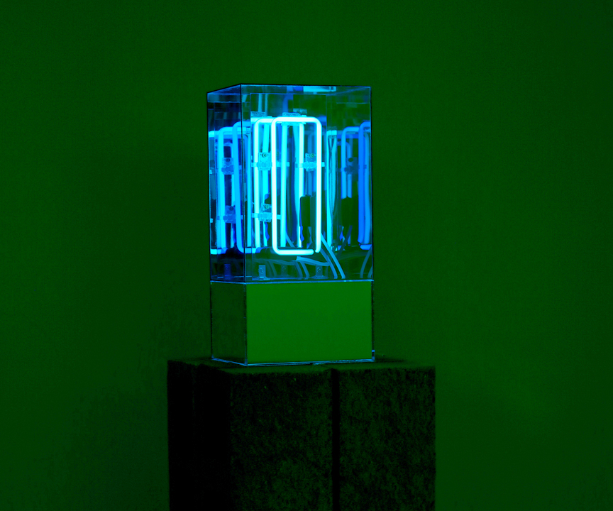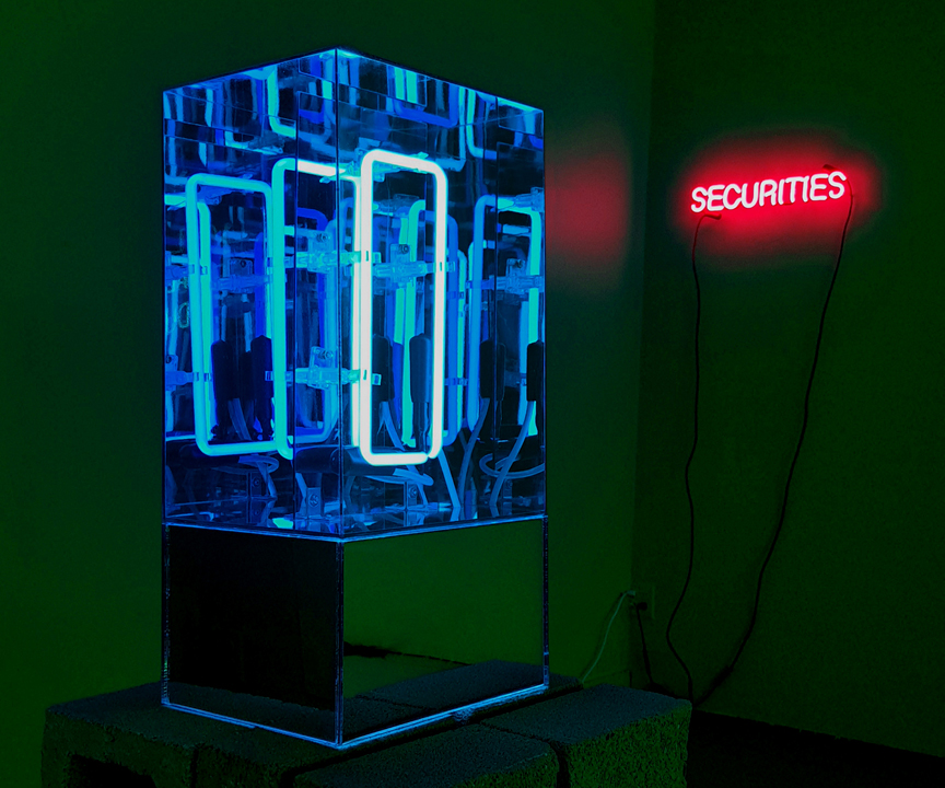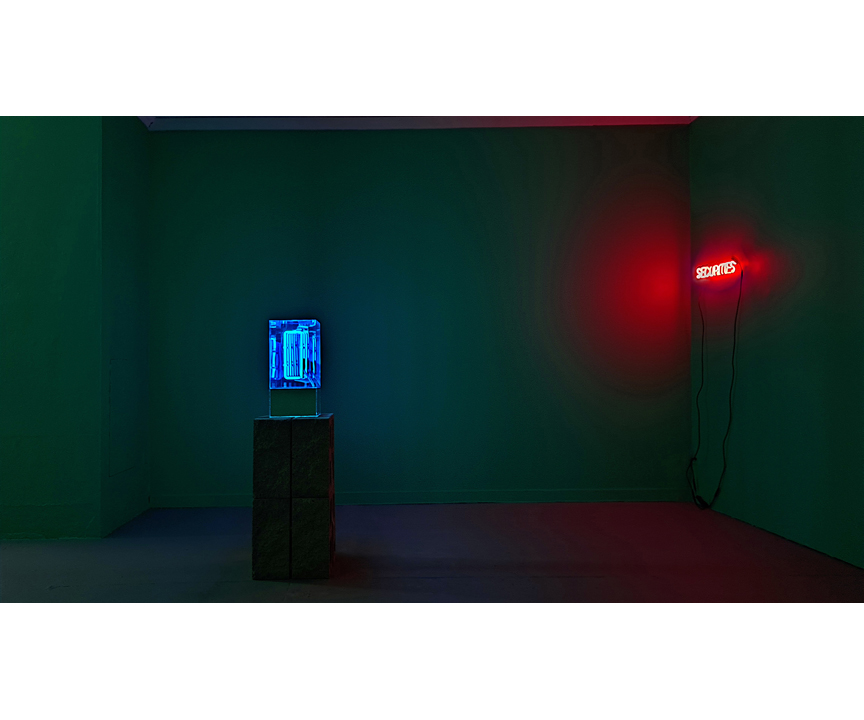 In dialogue with the neon text works, Senstad presents a new iteration in the static light sculpture series Ascension/Descension Graphs (2020 – ongoing ), with Ascension/Descension Graph X – a work that addresses the reduction of human value in society to a financial and corporate scaling system, graphs and spreadsheet, forecasting growth or decline. The sculpture series evolved during the pandemic, and act as memorial to the victims of the pandemic, where numbers of victims per week were presented to the public in the corporate graph system. The patterned sculptural neon abstraction Portal for Perpetuity VII (2023) is a new iteration in the illusionary infinity series, intimates nature’s perpetual cycle of regeneration and how mankind’s present grappling with notions of scarcity and of infinity through scientific progress and technological innovations continue to advance the human enterprise.