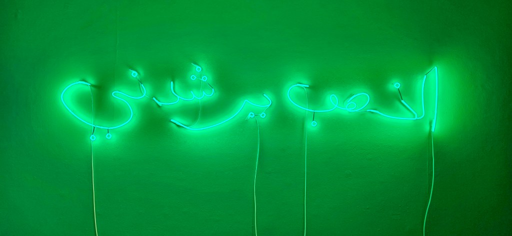 The center-piece of Mal Educación, a large scale green neon text work in Arabic calligraphy written in the artists own handwriting, is a self-referencing poetic proclamation with the original text work being Senstad’s monumental English version scaled after the Hollywood sign: Gold Guides Me, originally commissioned for the Bruges Art and Architecture Triennale in Belgium, 2015, curated by Lies Coppens, Till-Holger Borchert, Michel Dewilde.