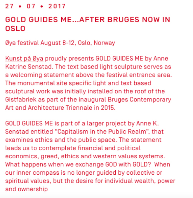 GOLD GUIDES ME – CAPITALISM IN THE PUBLIC REALM (2015), by Anne Katrine Senstad. Bruges Art and Architecture Triennale, Belgium