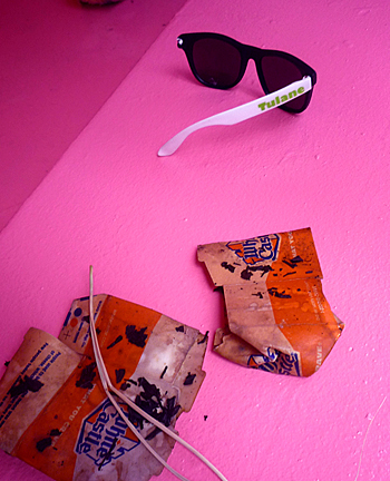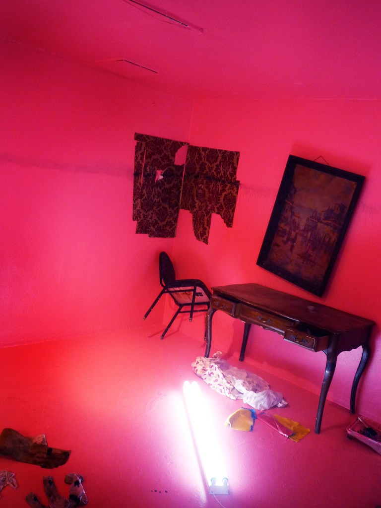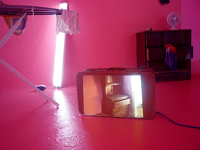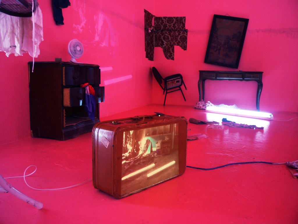 Senstad’s installation Diaspora USA Chapter is based on the remains of from numerous hurricane Katrina damaged shotgun cottages in the Lower 7th ward, St Roch neighborhood in New Orleans, found by Senstad and recreated from memory and documentation. The original derelict cottage installation is the home of Senstad’s site-specific memorial installation The Light House at KK Projects, curated by Dr Koan Jeff Baysa in 2007/08, and is the source for Senstad’s video piece, Light Writes Always in Plural – Section Three, 2009. As self referential to the passing of time through re interpretation and the emotional, psychological and healing value of memorials as creative process, the video trilogy Light Writes Always in Plural – Section One, Two and Three is projected onto a cardboard box, a suitcase and the wall in the gallery space. “The items used for the installation are arranged from memory of the remains of that particular cottage I created the original Light House installation in, and I have collected objects and paraphernalia from local sources that recreate a social/economic status of the displaced inhabitants, unable to return to their home due to US politics of re placement of peoples after natural disasters, the lack of governmental support, accountability, responsibility and efficiency towards citizens”, says Senstad. The walls serve as the exterior of the cottage with a floodwater line and spray painted inspection signature that still remains in New Orleans to this day. TFW (which stands for Task Force Wildcat – a national Guard Unit) with indications of date of inspection, number of dead people found in house, number of dead people removed from the house, and name of agency that performed the inspection.The 4 ft office lights are arranged in a similar pattern as in the projected video and the original Light House installation. The objective of reference to the original installation is based on aesthetics of documentation and archive, self reference as process and re-use of materials as a narrative source for this new installation. Senstad has added traces of ecological and anthropocene commentary in the installation, as a widened criticism, as seen in the painting from the canals of Venice hanging askew with the waterline crossing as a dark reminder of the effects of global warming, the broken sunglasses from Tulane University in New Orleans represent the broken future of generations to come with the threats of these global effects, and the repair efforts that are needed.