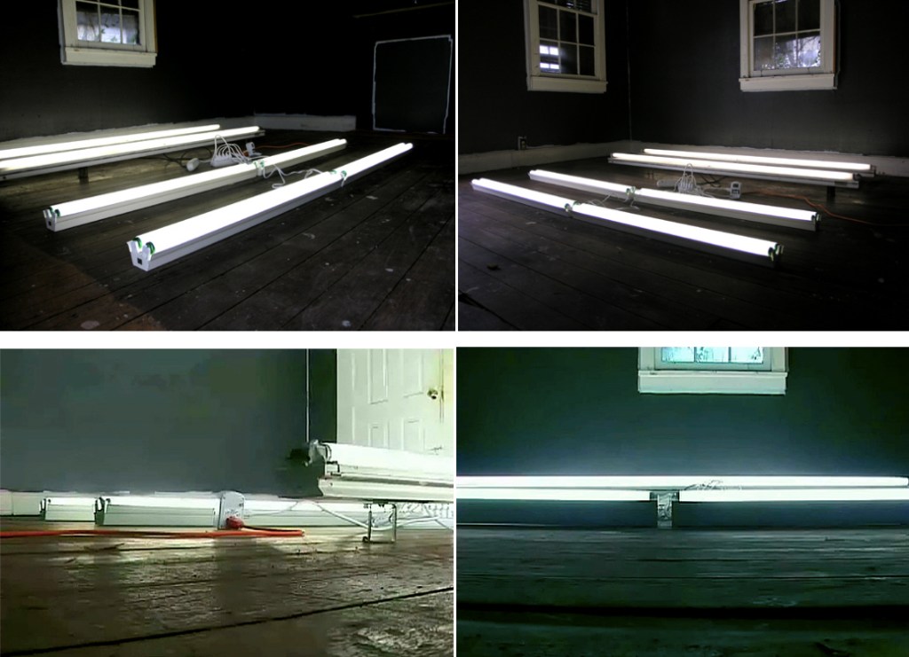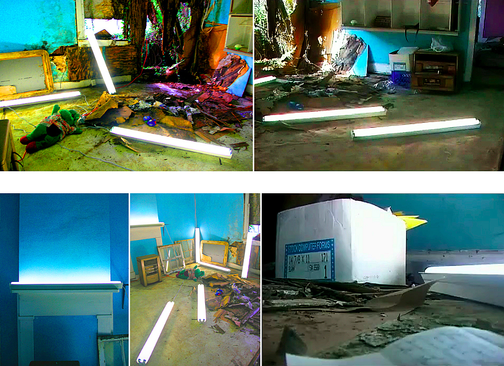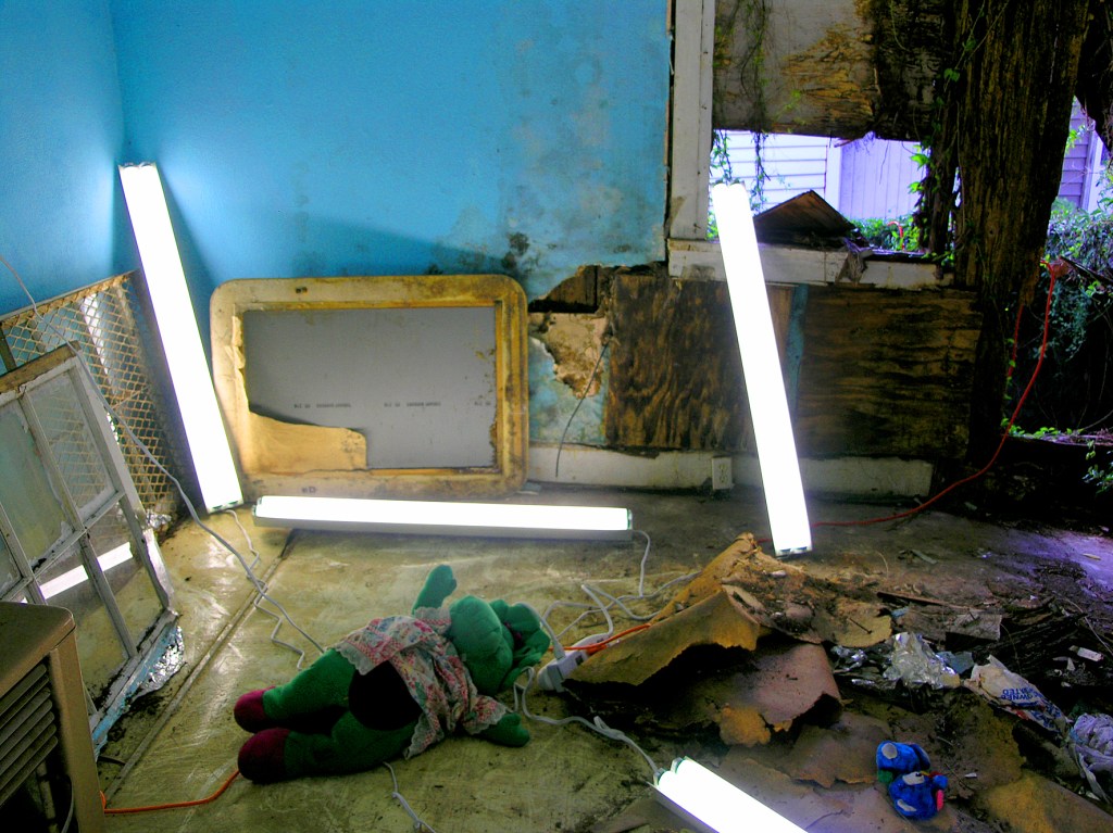 The interior light landscape consists of numerous industrial office lights placed within the structure of a Hurricane Katrina damaged derelict cottage in the St Roch neighborhood of New Orleans. Entering into an orderly room, the office lights are arranged in sequence. They display no emotion, just their own existence as sculptural form, as ceiling lights representing the world of the former inhabitants turned upside down. As the viewer passes the spatial state of seemingly calm order, we enter the display of poetic entropic disorder, and their random placement in the space. The formality and starkness of the office lights revealing remains of personal belongings, still intact in the spot they were left, displaying emotional intensity in their existence as evidence. The notion of time ceasing to exist is enlightened in the abandoned house as the manifestation of the effects of hurricane Katrina is revealed. Lifeless stuffed toys, decaying wall structures, muddy utensils and disorder are all evidence of entropy under light. As the environmental light changes from light to dark, day to night, the interior lights create a “living” memorial house. The overexposed interior, when viewed from the outside, brings light back into the abandoned home, it becomes a living shrine. As we step into the house, we experience a space of pure light, an industrial form of a sublime sacred space.