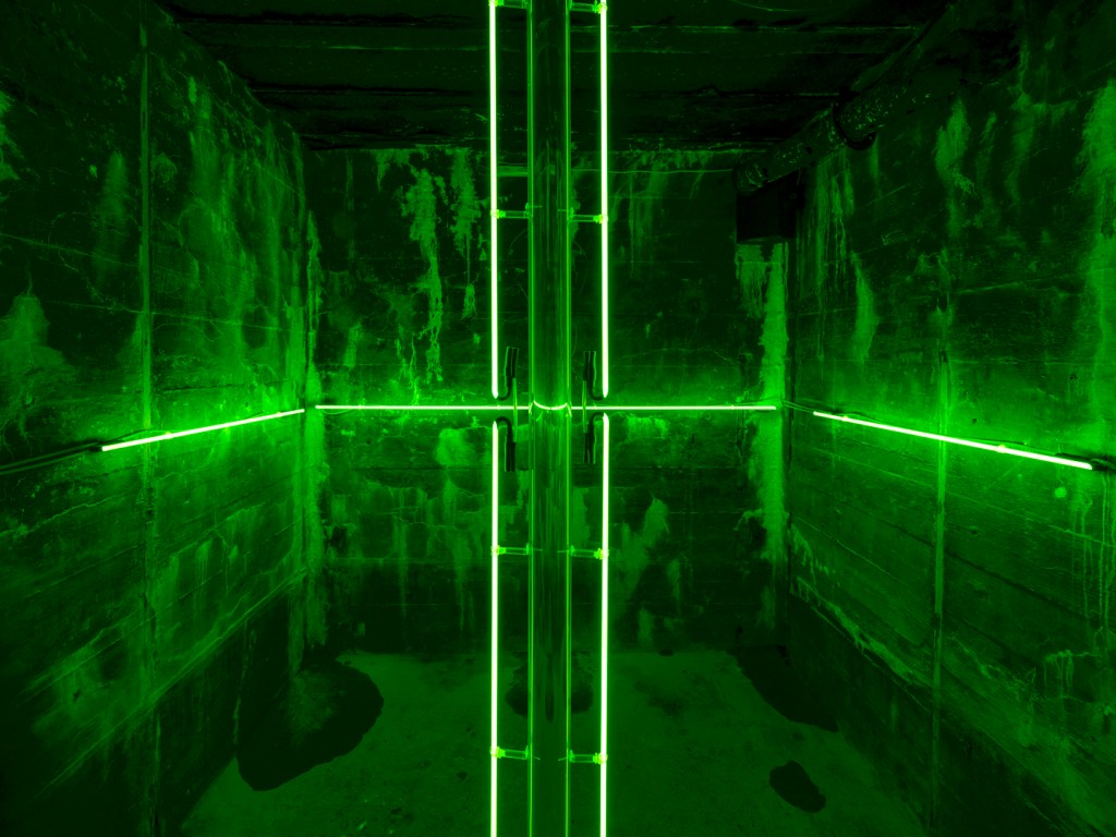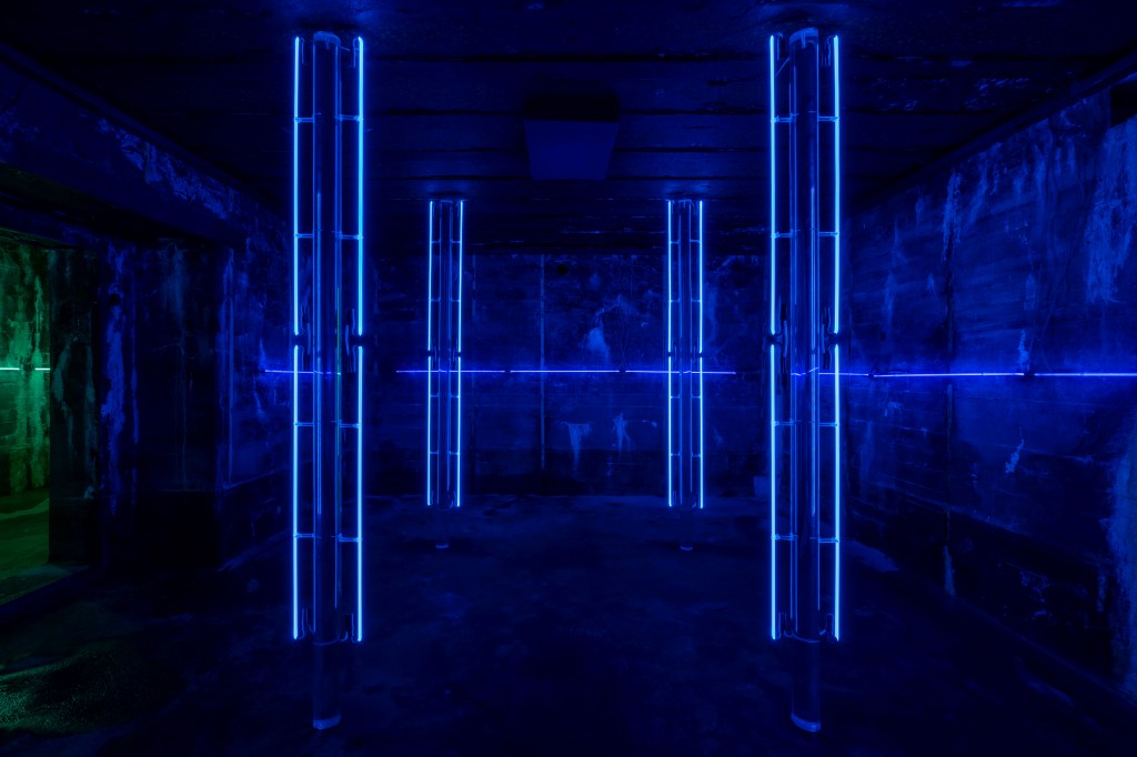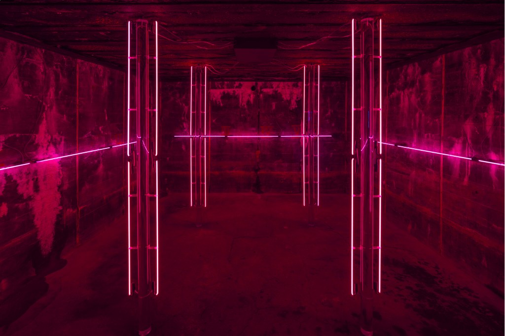 Elements VII, the seventh iteration in Anne Katrine Senstad’s series of spatial neon sculpture installations, transports the visitor through a commanding sensorial world of light, color and sound. The labyrinthian Commando bunker becomes a prismatic universe defined by four monochromatic chambers (Pink, Green, Blue, Yellow), where luminous slender columns, as a sculptural lattice, connect canonical form as representation with transmutational currents of technology, the perceptual and the expansive. Each of the four chambers are enveloped by a continuous sublime neon horizon gently slicing through traces of time, anchoring an ontological transformation of place, where our familiar boundaries dissolve as radiant neon colors expand into uncharted realms. Throughout POIESIS we encounter a process that encompasses the sensory, corporeal, affective, and experiential aspects of space suggesting regeneration in times of change.