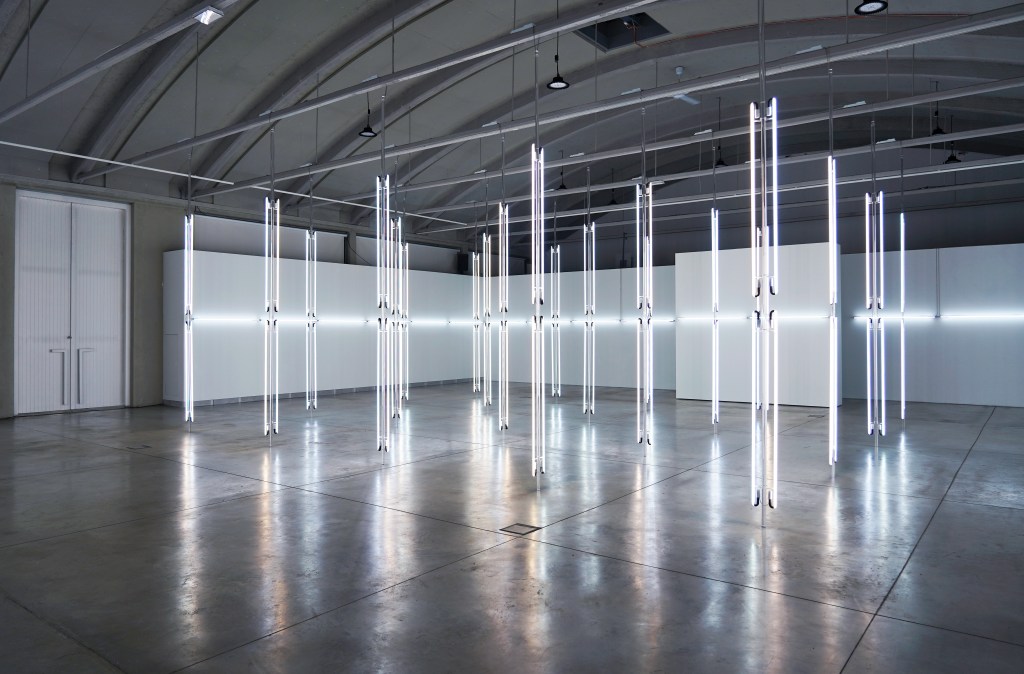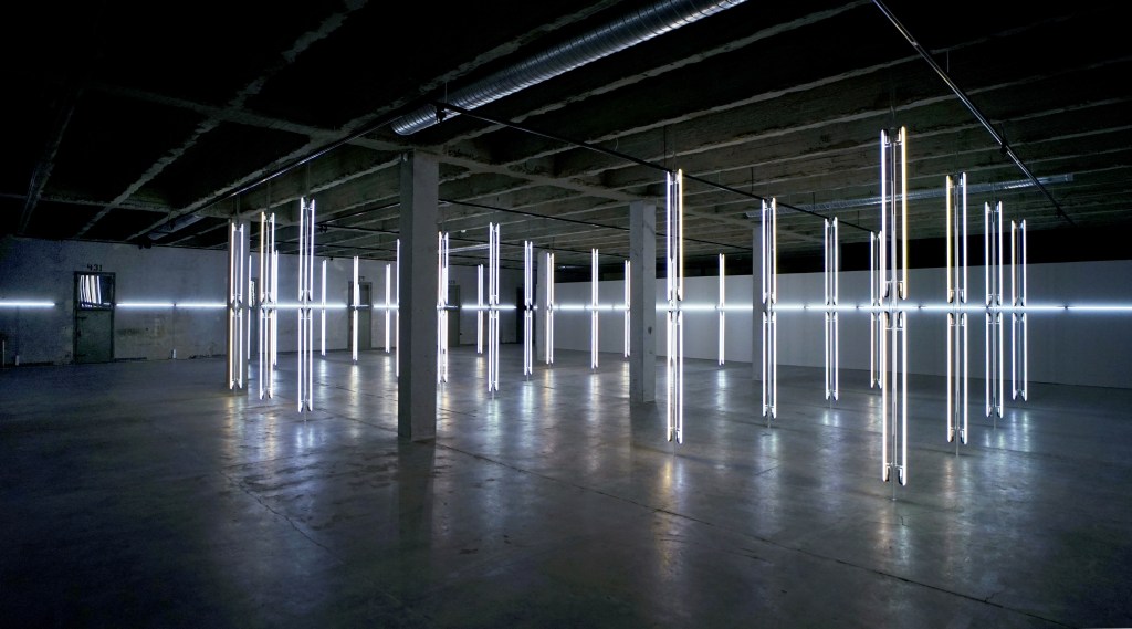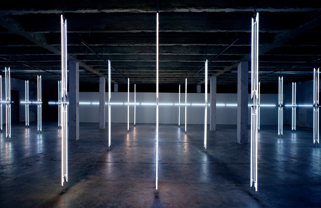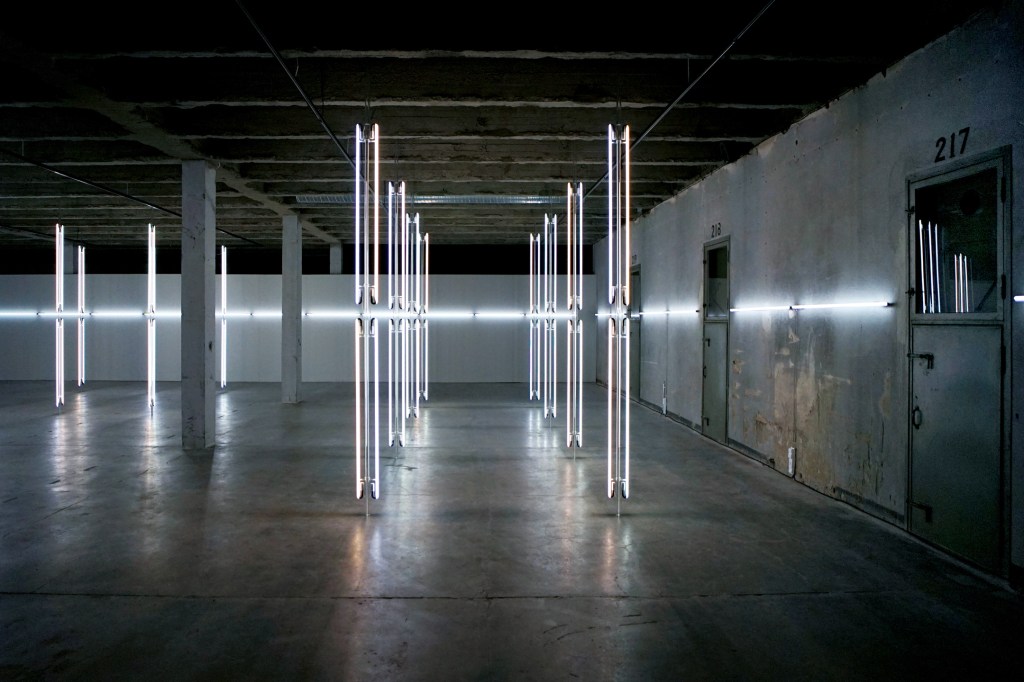 RADICAL LIGHT I, 2020 and II, 2021, are two sequential monumental light and sound environments that address the ephemeral sculpturality and the transformative potentials of the color white, set in two former military purpose buildings in countries that were formerly occupied, today autonomous European countries, where the former military industrial buildings have been transformed into contemporary art centers, serving culture and the public. The sensorial, minimalist neon light sculptures are a meditation on topologies of the indestructible and sublime. In concert with the light sculptures, a hypnotic, vast enveloping sound space moves through particles and electric currents, created for the installation by acclaimed composer JG Thirlwell. Radical Light I constitutes the art work ELEMENTS IV and The Sensory Chamber IV, 2020, Radical Light II, constitutes the art work ELEMENTS VI and The Sensory Chamber VI, 2021.