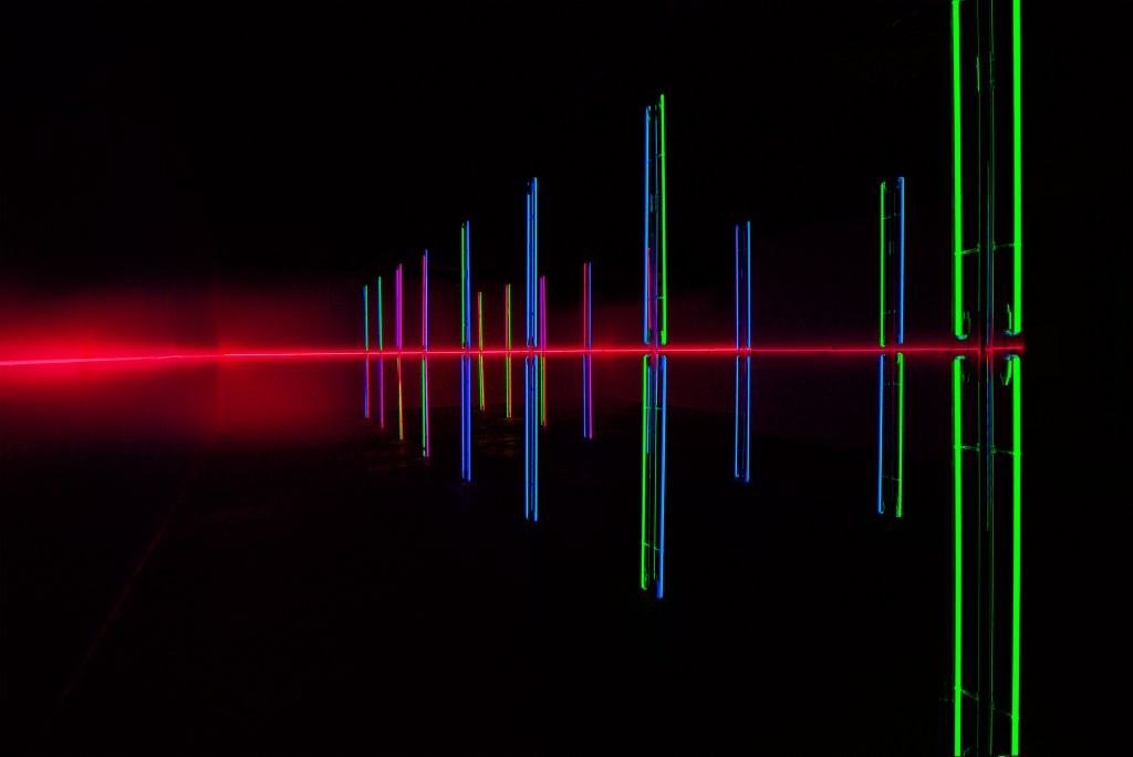 ELEMENTS I is the first neon structure in the ELEMENTS series, and is an experiential installation built on elements of the perceptual phenomena of light, color, potent space and passages of time, ideas of sound and geometry, spectra and particles. An amalgamation of sensations. All sensorial elements have scientific and experiential similarities, yet differ in nature in how they inhabit space and how they are experienced. The natural world can be perceived through scientific systems of frequencies, wavelengths and temperatures that are sensed by the eye, ear, brain, nerves, intellect and emotions.