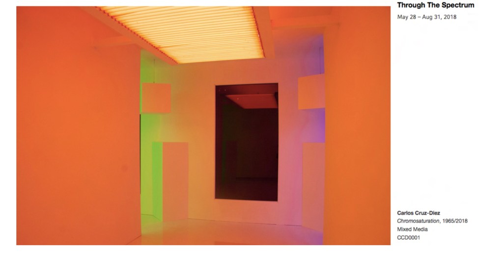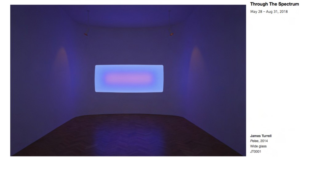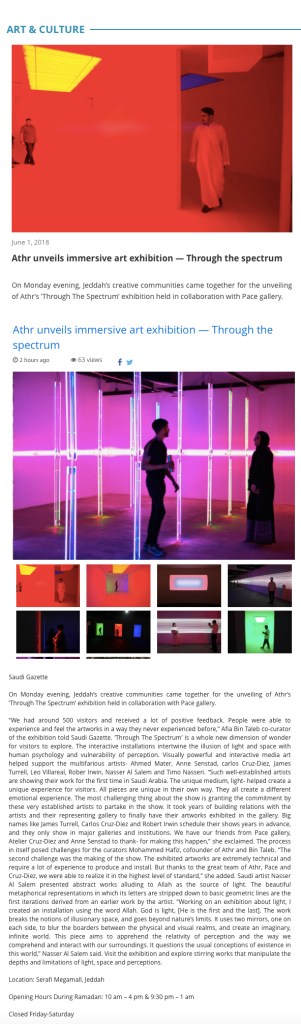The exhibition Through the Spectrum – A Light and Space Survey presents light and space artists Anne Katrine Senstad, James Turrell, Robert Irwin, Carlos Cruz-Diez, Leo Villarreal, Timo Nasseri, Nasser Al-Salem, and Ahmed Mater in the first major light art exhibition held at ATHR Gallery in the Middle East in 2018, co-organized by Anne Katrine Senstad, PACE Gallery, and Cruz-Diez Foundation.