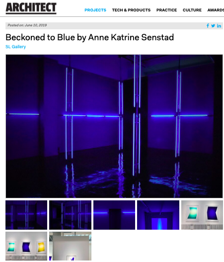 ARCHITECT Magazine, 2019. Beckoned to Blue, SL Gallery, New York: Color embodies the universal; ascending light represents the connection with the universe, while horizontal lines can remind us of the open landscape, the sea merging with the sun, perhaps internally experienced as a sensation of tranquility and eternity. – Anne Katrine Senstad: read