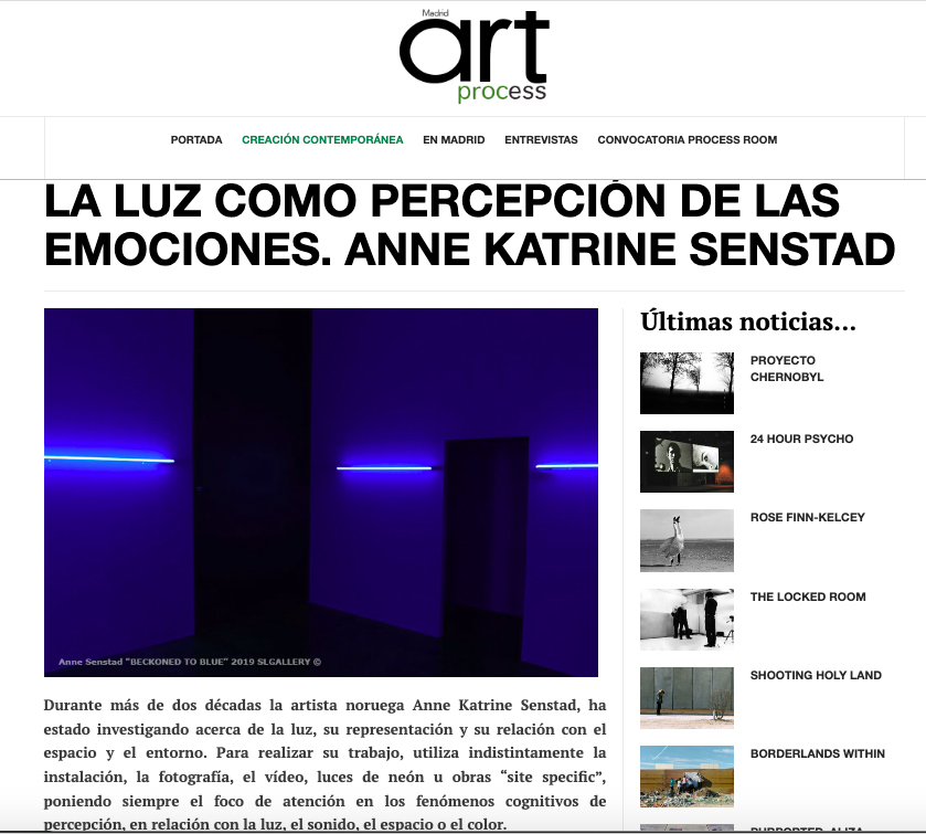 MADRID – ART PROCESS, Spain, 2019 – an indepth presentation on Senstad’s light and space practice, in the Spanish art journal Art Process. Read more here