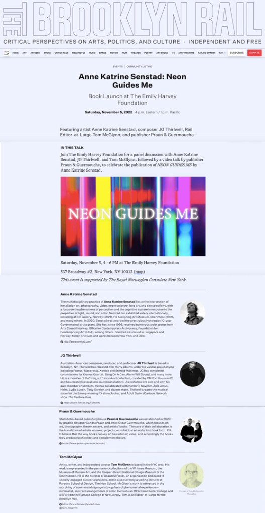 Exhibition and NEON GUIDES ME Book release Emily Harvey Foundation, New York – A panel discussion with Anne Katrine Senstad, composer JG Thirlwell, artist and managing editorBrooklyn Rail Tom McGlynn, and a streamed presentation by Neon Guides Me book designer and publisher Praun & Guermouche via Stockholm. Supported by the Royal Norwegian Consulate General New York, 2022.