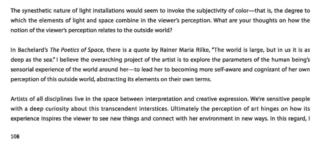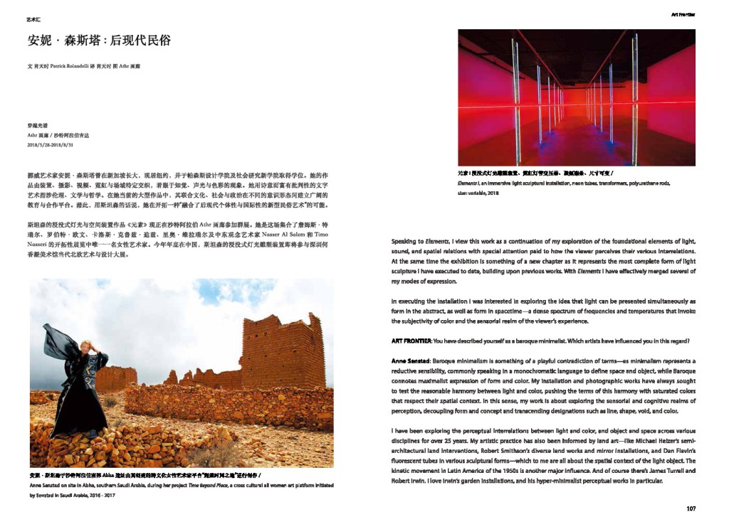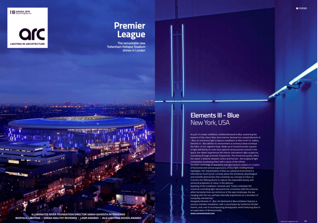 EAZEL Magazine, Issue 40, Korea, 2018 by Tansy Xiao and Patrick Rolandelli. – “Last May Anne Katrine Senstad, a Norwegian artist living in New York, unveiled her latest work, ‘Elements’ as part of ‘Through the Spectrum’—a group exhibition at Athr Gallery in Jeddah, Saudi Arabia presenting Senstad’s work alongside that of James Turrell, Carlos Cruz-Diez, and Robert Irwin. Senstad views ‘Elements’ as the culmination of her lifelong project of exploring light as a medium, narrative, and connection between space and environment. Throughout her career her sculptures and installations have invited the viewer to a meditative spatial experience”.Read more here