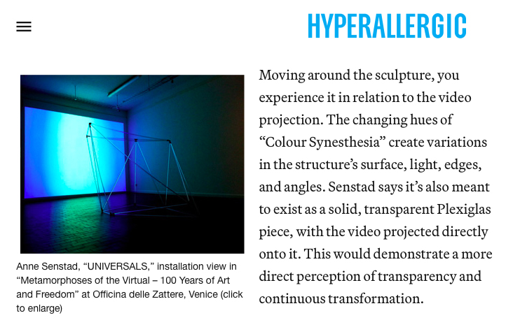 Sight, Sound and the Colors of Perception by Sarah Walko. in Hyperallergic.com, 2013: “The Norwegian painter Edvard Munch would listen to the radio tuned in between two radio stations. I see this image as the space artists work in.” —Anne Katrine Senstad, in conversation with the author.” Read more here