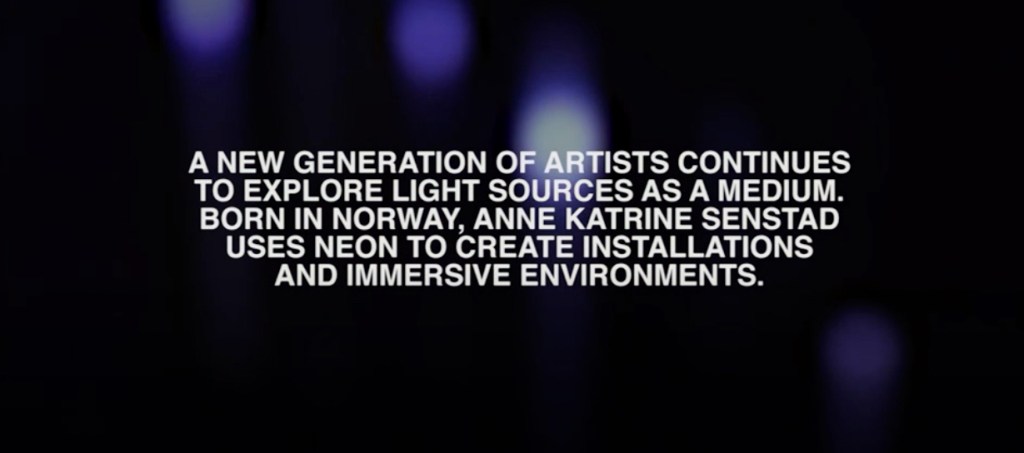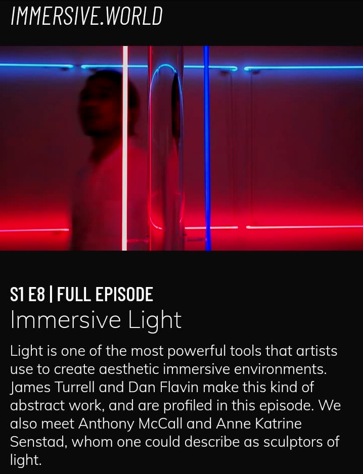 IMMERSIVE LIGHT – As part of the Emmy Award winning Television documentary series Immersive World (2020-2022), filmed in 2019 – E9, S1 presents the light sculpture practice of Anne Katrine Senstad together with Dia Art Foundation/Dan Flavin, and Anthony McCall. The cultural documentary series has been broadcast on major TV stations in France, Germany, Italy, USA, and is producd by Allartstv.org, Producing Partners, WNET. The series is available to stream on PBS .org. See an excerpt here – In the US, view full episode here – in the PBS library until 2031