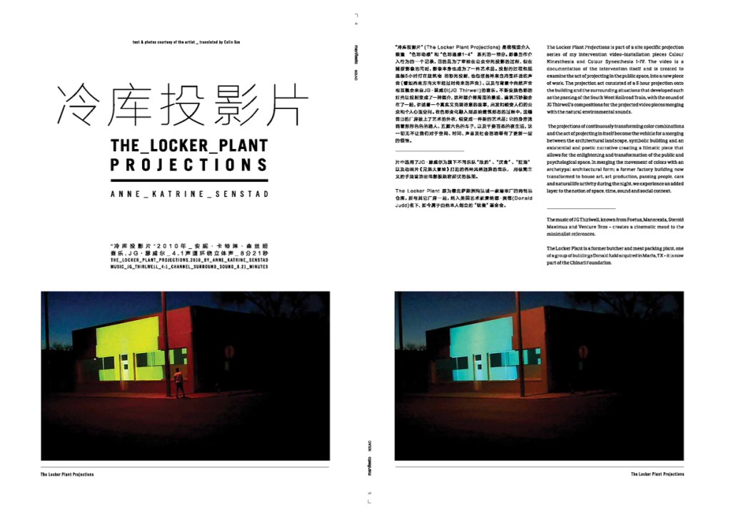 Manifesto Architecture Magazine, Shanghai, 2012. The Light and Space issue presents Senstad’s site specific video projection work The Locker Plant Projections created at the Donald Judd Foundation in Marfa, Texas, 2010, and the resulting short film with the same title, was screened with Rencontres Internationales at Centre Pompidou, Paris, Haus der Kultur der Welt , Berlin, Beirut Art Center, and in Madrid, 2010-11. More on The Locker Plant Projections (2010) with sound composed by JG Thirlwell.