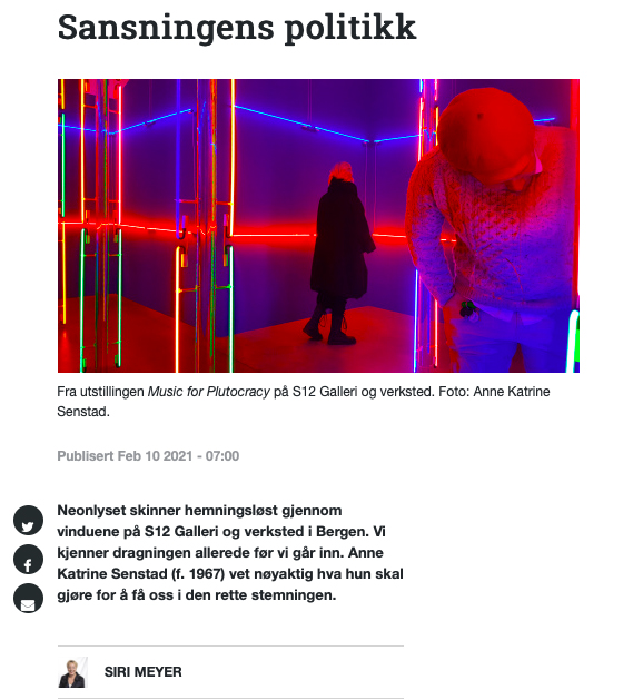 Kunstmagasinet : The Politics of Perception by Siri Meyer / Sansningens Politikk av Siri Meyer, 2021. Art review on Senstad’s solo exhibition Music for Plutocracy at S12 Gallery, in Bergen, Norway. Read more here (Norwegian)