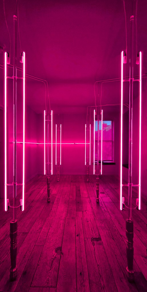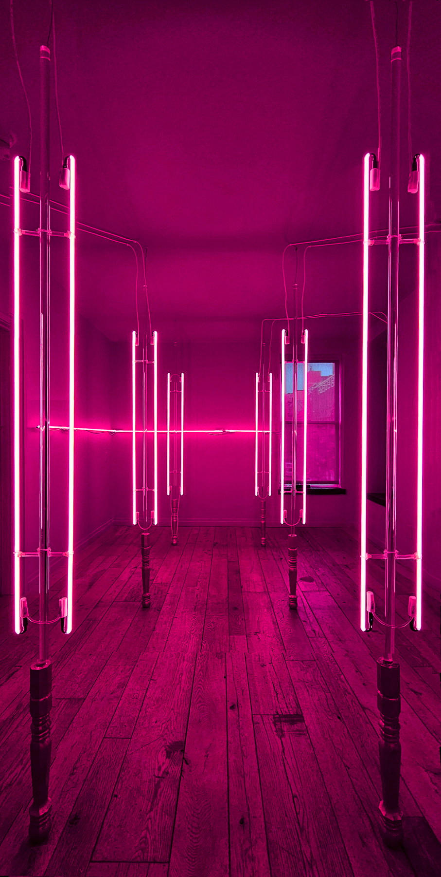 On Floor 3, Anne Katrine Senstad presents a new iteration in her neon installation series, ELEMENTS, entitled The Pink Room Has No Walls – Elements VIII (2025), accompanied by an audio environment by acclaimed composer JG Thirlwell. The neon installation, can be entered through the conceptual, structural, and perceptual, – a site specific, spatially transformative light sculpture. The art work invites the viewer to encounter inner mechanics of sensory experience, electricity and noble gases, the nature of our physiology, and the phenomena of an illusionary space of vertical topology. Here, in this room, the novelty of saturated monochromatic pink is experienced as a transformed domestic habitat, now defined by suspended lines in space that alters the concept of the personal, lived chamber, through spectrums of light, color and sound.