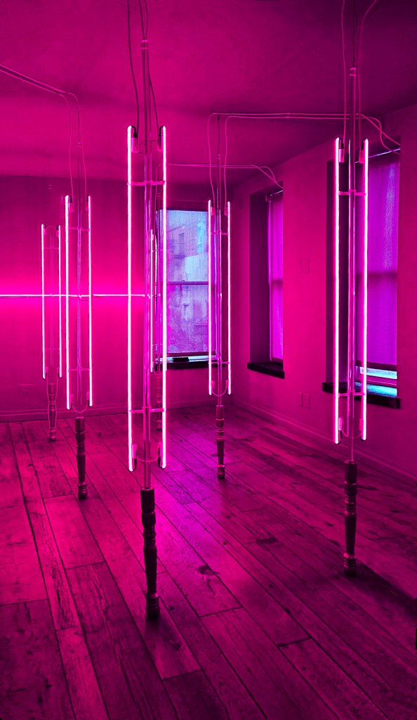 The pink room is enveloped by windows allowing for the outside world to participate in the work, Chinatown neon signage, busy restaurants and apartment buildings, where clear blue daytime sky or grey days are altered by chromatic pink, turning the outside world green. The busy city night-time presents a sequence of darkened, reflected window-portals with city infrastructure and utilitarian lights of commerce. Viewed from the exterior, the illuminated 4 story historic house appears to the by-passer as an art work in totality, the domestic house has been transformed.