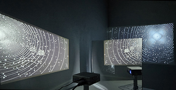 Senstad works with analogue and contemporary technology as method for de-constructing spatial concentric form, light leaks, particles, and transitory merges, as an aesthetic material and experiential narrative. Form and movement are reduced to glitches, sparkles, and flickering, harkening to early space imagery, technology noise, and distributed signal error.