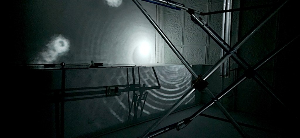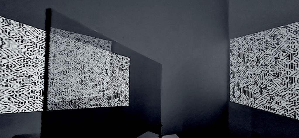 Installation views: Chiasm of Lament I, II, III (2025). Audio-video projection, mirror, sound.