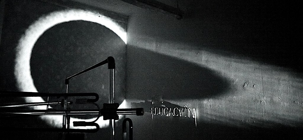 In dialogue with The Chiasm, the audio-visual trilogy Chiasm of Lament, is projected with a mirror placement, reflecting a concentric form into the gallery space. Here Senstad works with both analogue and digital technology as methods of deconstructing the liminal spheres of technology and generative information that has been given spiritual and existential power. Form and movement are reduced to a language of glitches, sparkles, and flickering, harkening to early space imagery, noise, and distributed signal error. Likewise, with the neon text work Mal Educación, Senstad realizes her own characteristic form of Wittgenstein’s language-game and word-meaning, a space where language is defined by the actions through which it is woven. Mal Educación is a word-play of the idiom Mala Educación, as well as a nod to Spanish film director Pedro Almodóvar’s 2004 film, Bad Education, depicting the nature of oppression of institutions of power over the disenfranchised and marginalized. Illuminated by Almodóvar’s cinematic acuity, Senstad’s work looks at how critical discourse can be explored through the lens of philosophy, aesthetics, and linguistics as expressed by the sensorial and experiential languages of light, space, and color. The exhibition is supported by Office for Contemporary Art Norway
