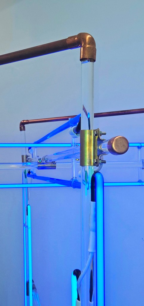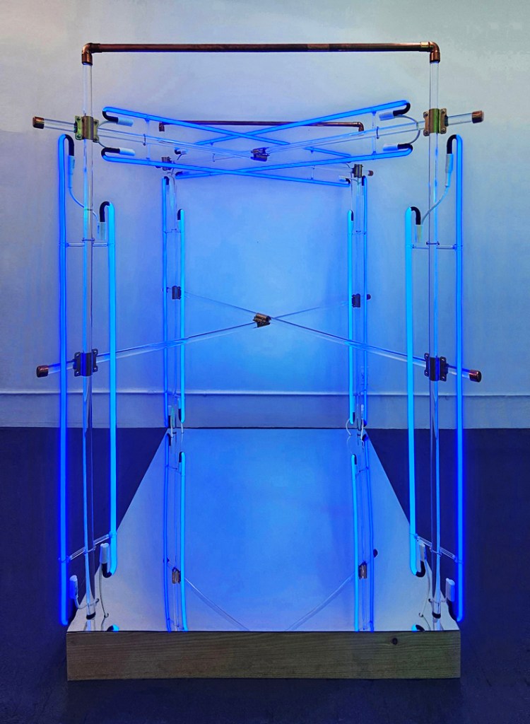 The Chiasm, is a Cobalt blue neon light and mirror sculpture installation with the semblance of a deconstructed manifestation of Constructivist Taitlin’s Tower. Senstad utilizes utilitarian, readymade materials, construction scaffolding aesthetics, and copper plumbing parts, reflecting the sacred in the ordinary. The installation acts as a portal within a confined space, a structural void.