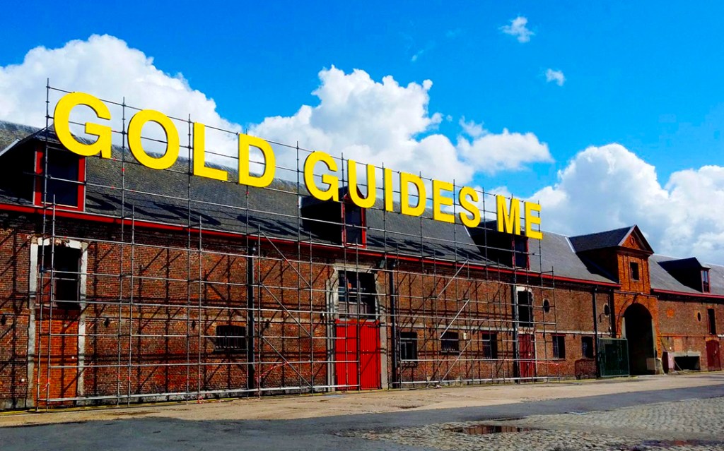 Gold Guides Me – Capitalism in the Public Realm,(2015) by Anne Katrine Senstad. Placed on the exterior of the historic Giestfabriek in Bruges, Belgium. LED signage, aluminum letters, scaffolding. Scale: 2 m H x 28 m L.