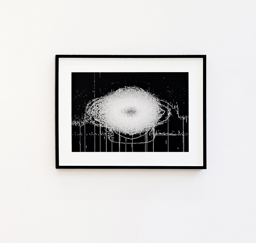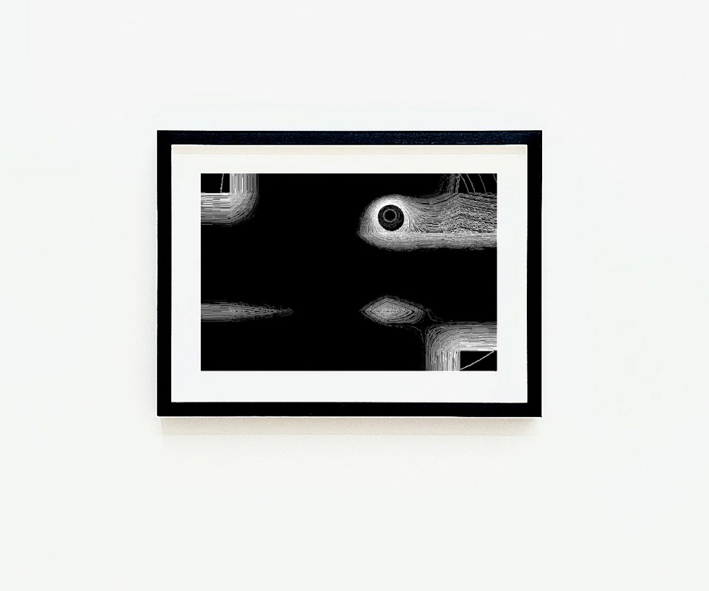 In the Chiasm of Lament Collages, the artist furthers the original source video material by extracting from its own re-composition, departing from the moving image itself, utilizing what remains in the aftermath. Here the collaged video imagery turns to print form as an amplified convulsion of somber beauty and cosmology.
